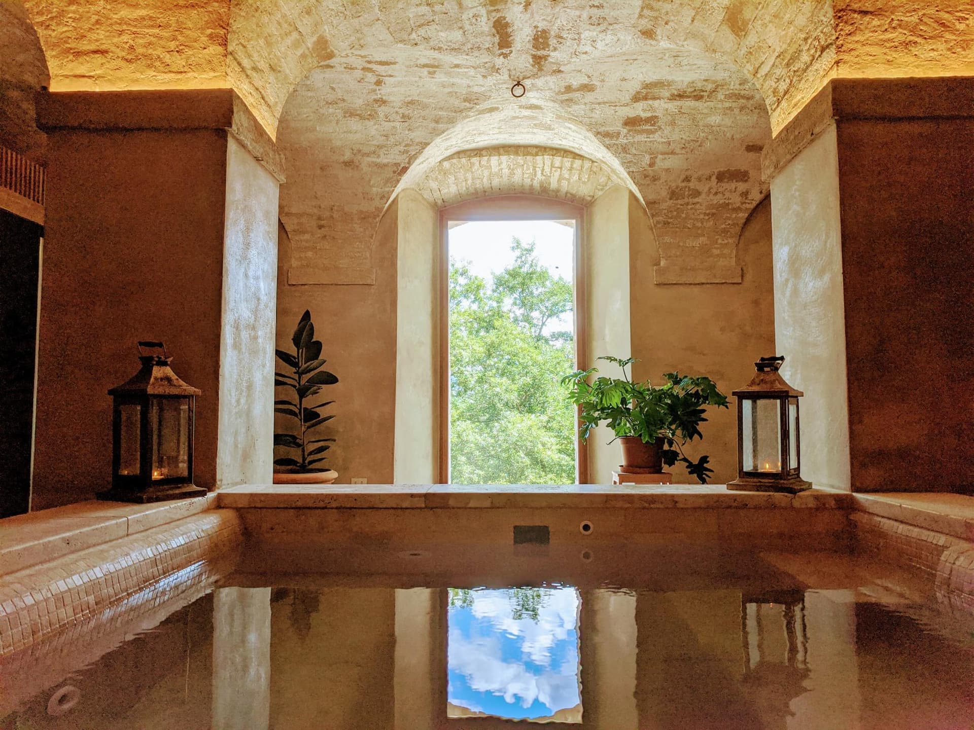 Bellissime piante circondano il nostro nido di travertino creando un dialogo tra elementi come la trasparenza dell’acqua, il calore della pietra e la vitalità del brillante sempreverde